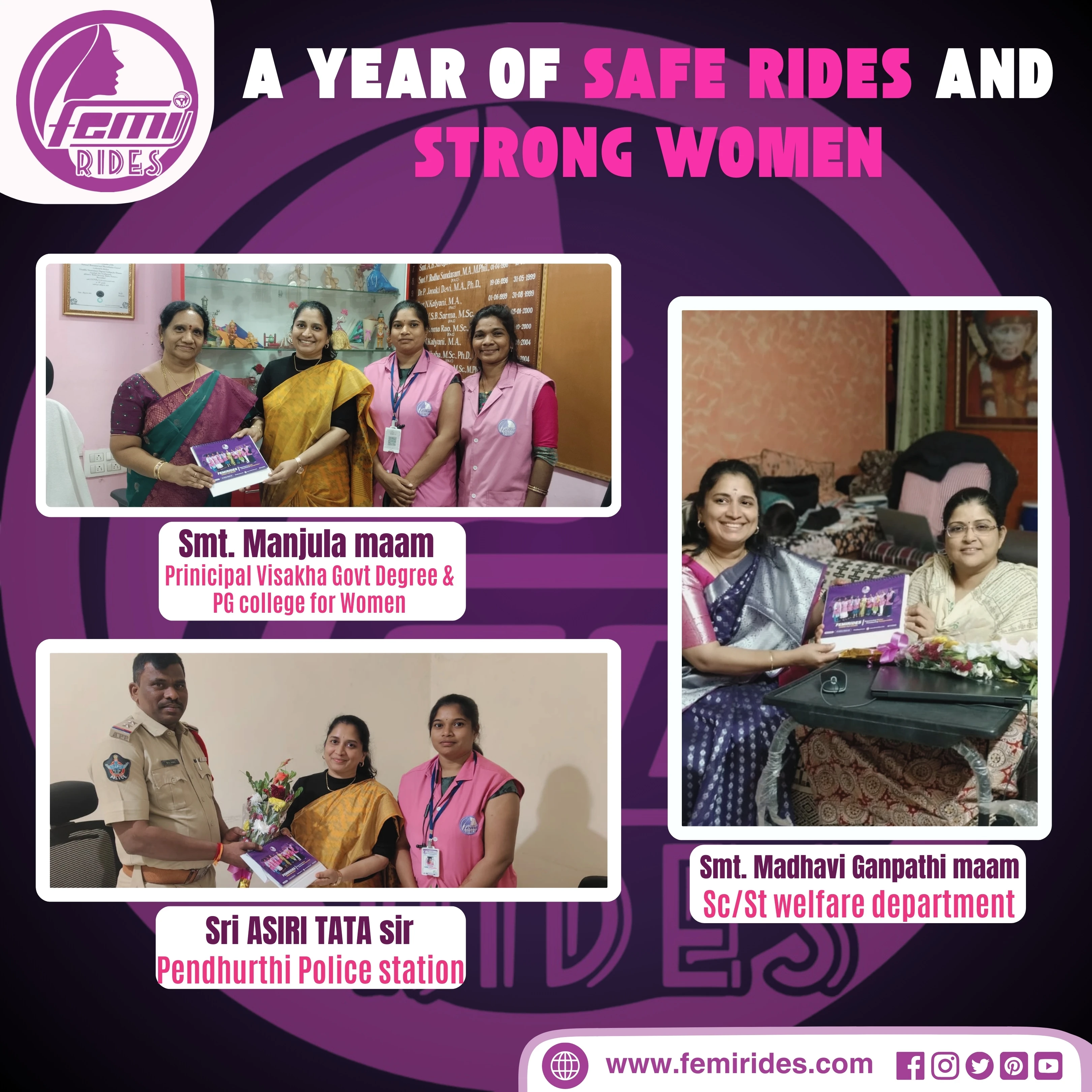 At Femi Rides, our mission has always been to empower women by providing safe, reliable, and comprehensive transportation solutions tailored specifically for their needs. As part of our ongoing commitment to this mission, our founder, Radhika Behera, recently embarked on an inspiring journey across Vizag, meeting with key community leaders and stakeholders to launch the Femi Rides 2025 Calendar. This initiative aims to strengthen our ties with the community and promote our vision of a safer and more empowered society for women.